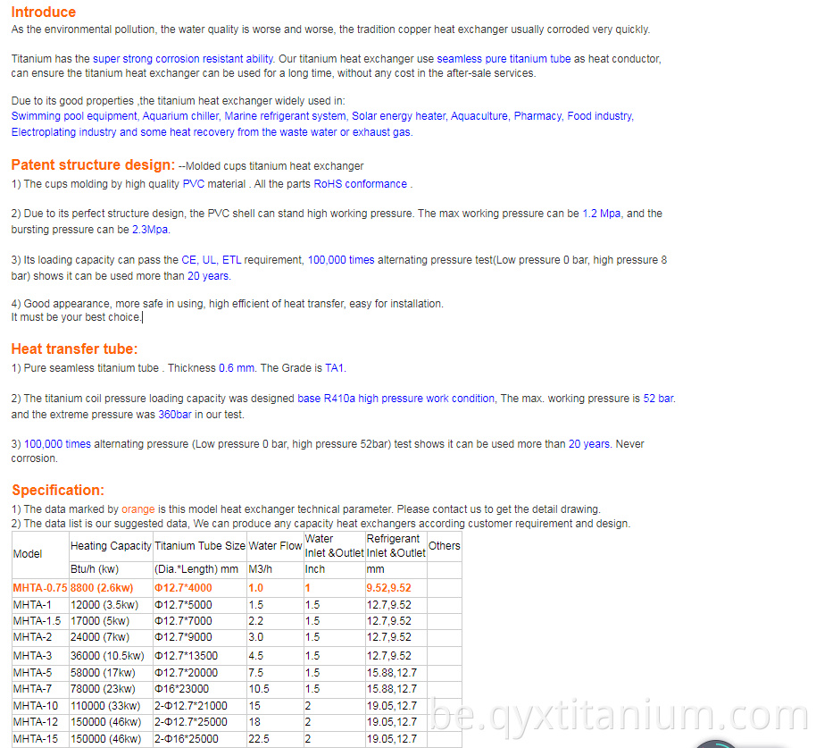 Высокая эфектыўнасць тытанавага цеплаабменніка Titanium GR2 складаецца з розных тытанавых сплаваў. Існуе больш за 40 розных тыпаў тытанавых сплаваў. Выкарыстанне труб адрозніваецца, напрыклад, высокаэфектыўная тытанавая абалонка Gr2, цеплаабменніка трубкі якія выкарыстоўваюцца ў кандэнсатараў і цеплаабменніка тытанавых труб, якія выкарыстоўваюцца ў цеплаабменніках. Тытан - гэта натуральна моцны метал, а сплавы маюць розныя суадносіны тытана ў складзе. Існуюць таксама камерцыйна чыстую тытанавую трубку і тыпы цеплаабменнікаў з сплаву з тытанавымі матэрыяламі. Трубы могуць быць бесперашкоднымі, зварныя, падробленыя або электрычны супраціў. Штрафныя тытанавыя трубы выкарыстоўваюцца ў дадатках да спецыяльнага прызначэння. Існуюць розныя спецыфічныя тыпы труб, такіх як тытанавыя U-спаганяльныя трубы , якія выкарыстоўваюцца ў цеплаабменніках. У трубках U мае перавагу ў тым, што ў сістэме не патрабуецца шмат раздымаў выгібу. Бесперашкодная тытанавая труба з выгібай выкарыстоўваецца ў памерана дакладных высока адчувальных цеплаабменнікаў. Розныя адзнакі тытана прыходзяць за розныя выдаткі. Цеплаабменнікі тытана 5 класа даволі часта сустракаюцца, бо ў іх баланс трываласці, каразійнай устойлівасці і эканамічнай эфектыўнасці. Высокая эфектыўнасць тытанавага ракавіны Trubner Shell Tebner выкарыстоўваецца з прыкладаннямі кандэнсатара, якія павінны апрацоўваць крыягенныя тэмпературы. Тытанавыя сплавы валодаюць высокай тэмпературнай устойлівасцю да павышанай тэмпературы, а таксама крыягеннай тэмпературы. Такім чынам, высокая эфектыўнасць тытанавых ракавінных ракавінных труб і іншых тыпаў труб выкарыстоўваюцца пры высокім ціску, высокай тэмпературы і крыягенным дадатку